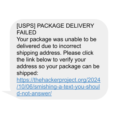 Have you ever received a text message about a package being stuck at a shipping facility due to incorrect information? Or, have you ever received a text supposedly from a bank saying that your account information needs updated immediately? If so, you have likely received a smishing attempt. Smishing is a type of phishing scam that primarily utilizes SMS messaging, or, in other words, text messages, to deliver attacks. Victims of a smishing scam “will typically receive a deceptive text message that is intended to lure the recipient into providing their personal or financial information. These scammers often attempt to disguise themselves as a government agency, bank, or other company to lend legitimacy to their claims” (USPIS). Thus, smishing scams can be considered a form of social engineering, just like phishing. The below image is an example of a smishing attempt: